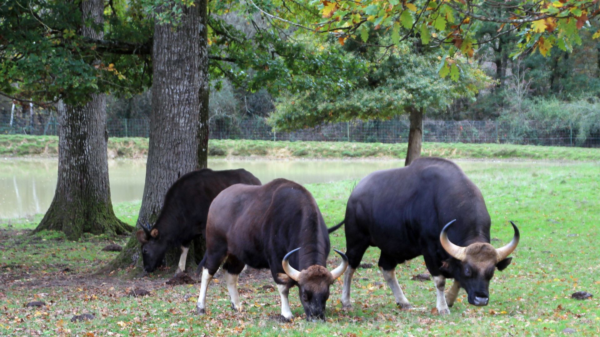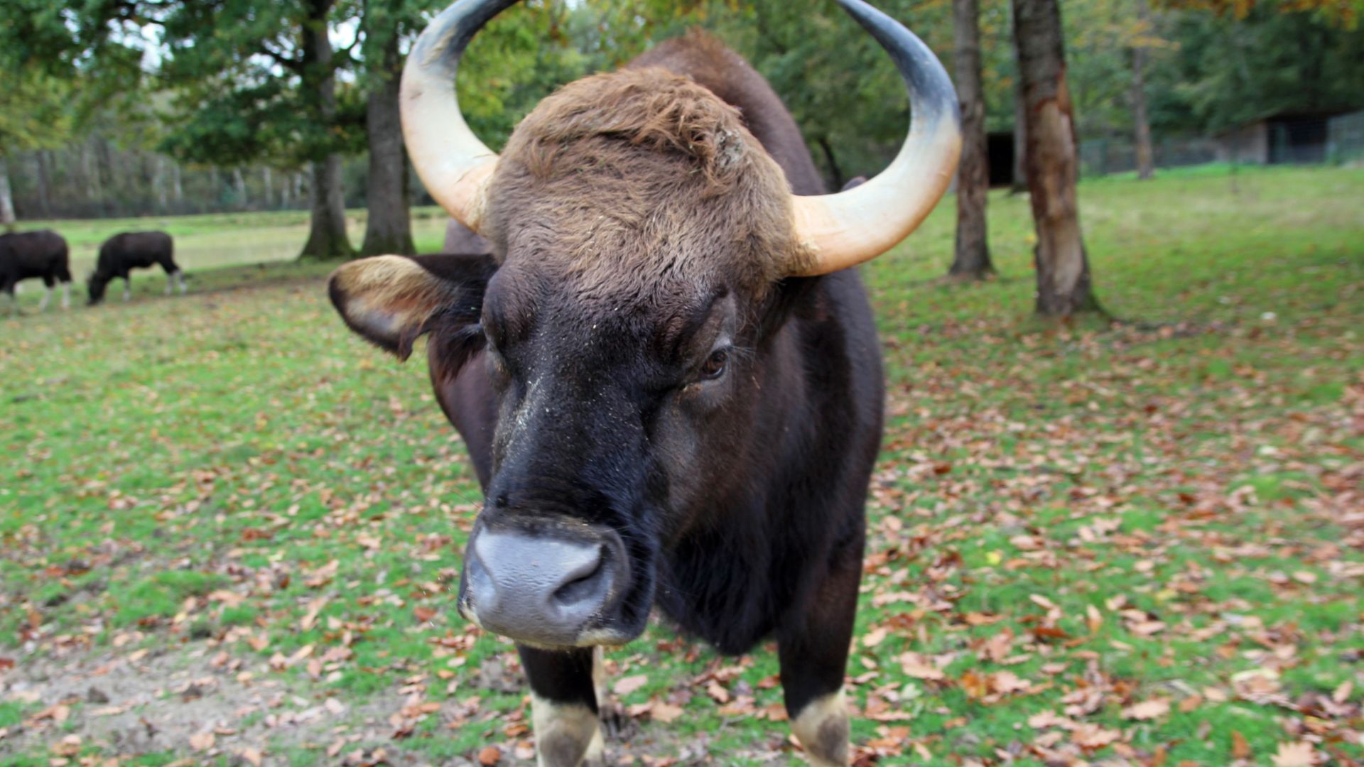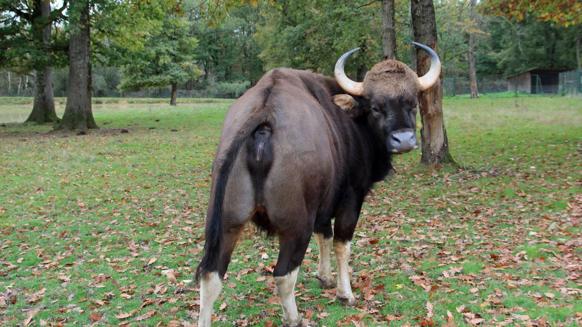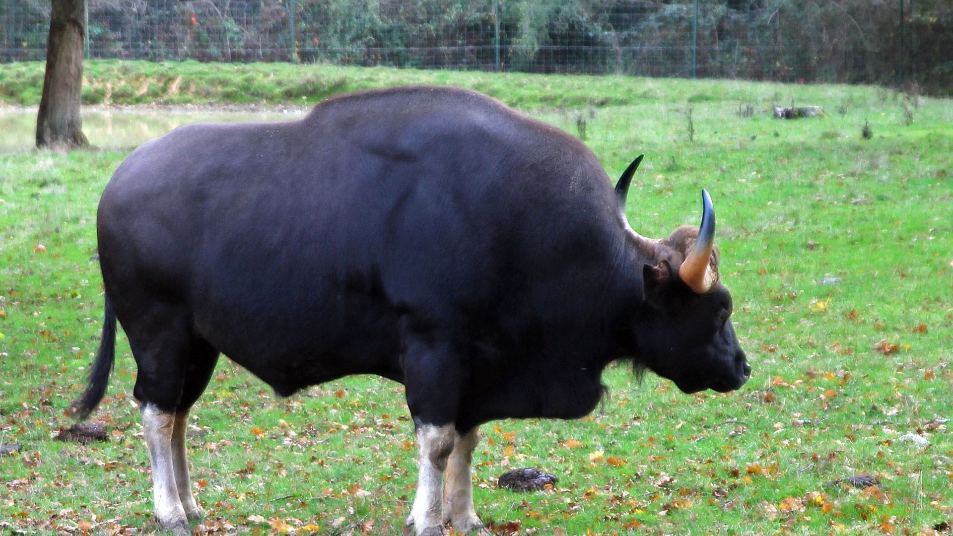 Le gaur (Bos frontalis / Bos gaurus) est un des plus puissants et des plus gros bovidés de la planète, un véritable colosse qui peut peser jusqu'à 1.000 kg et mesurer plus de 2 m de hauteur au garrot ! Originaire d'Asie, il tient aisément la comparaison face au buffle d'Afrique et au bison d'Amérique. Le gaur est parfois également nommé bison Indien ou encore seladang. C'est un géant musculeux mais timide qui vit en hardes actives la journée et cherche à éviter l'homme et le tigre, les seuls prédateurs qui osent se mesurer à lui. Mâles et femelles sont dotées d'une paire de cornes recourbées au bout noir qui peuvent dépasser les 60 cm de long. Un temps considéré comme une espèce distincte, le gayal, sorte de mini-gaur domestiqué aussi appelé mithan et aux caractéristiques distinctes (taille et cornes plus petites, cou plus court, front large...), appartient à la même espèce Bos frontalis.