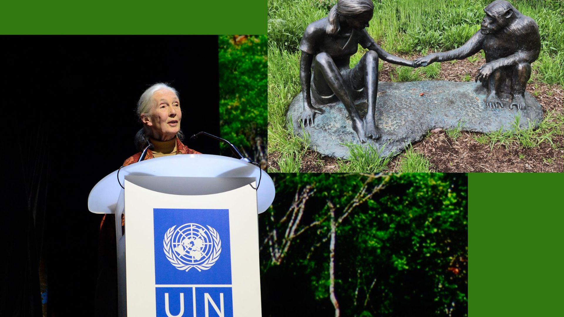 Par ses observations fines et détaillées des comportements des chimpanzés, travaux d'étude qu'elle débuta en Tanzanie dans les années 1960, elle a apporté un regard nouveau et révolutionnaire sur la façon dont on percevait jusque-là ces grands singes. Grâce aux véritables amitiés qu'elle noua avec les singes David 'Barbe Grise' GREYBEARD (immortalisé sur la sculpture en photo avec une jeune Diane lui tendant la main) et son ami Goliath, elle accéda en immersion au quotidien de leur groupe et put observer à loisir leurs comportements mêlant diplomatie et politique, utilisation d'outils, vengeances et colères ou actes d'empathie. Ses études ne manquèrent pas de défrayer la chronique, jetant des ponts troublants entre nos possibles ancêtres, ces grands singes pensants et nous-mêmes.