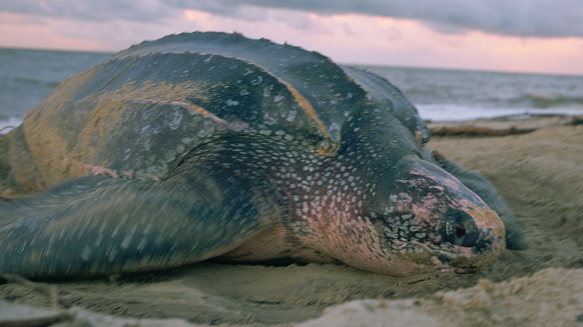 Outre ses dimensions extra-larges (2 m de long !) et son absence d'écailles, la tortue luth (Dermochelys coriacea) ou 'leatherback turtle' (soit la 'tortue à dos de cuir' en référence aux plaques osseuses recouvertes de peau et d'une épaisse couche de graisse qui lui font office de carapace) se distingue par son appartenance à une famille (les Dermochélydés) différente des autres espèces de tortues marines. Grande voyageuse résistante et infatigable qui parcourt le monde en solitaire en suivant les courants océaniques, elle est surtout visible quand elle gagne les plages de sable pour venir pondre avant de repartir au large. Son nom lui vient de la forme de sa carapace qui rappelle celle du luth, l'instrument à cordes pincées de la Renaissance.