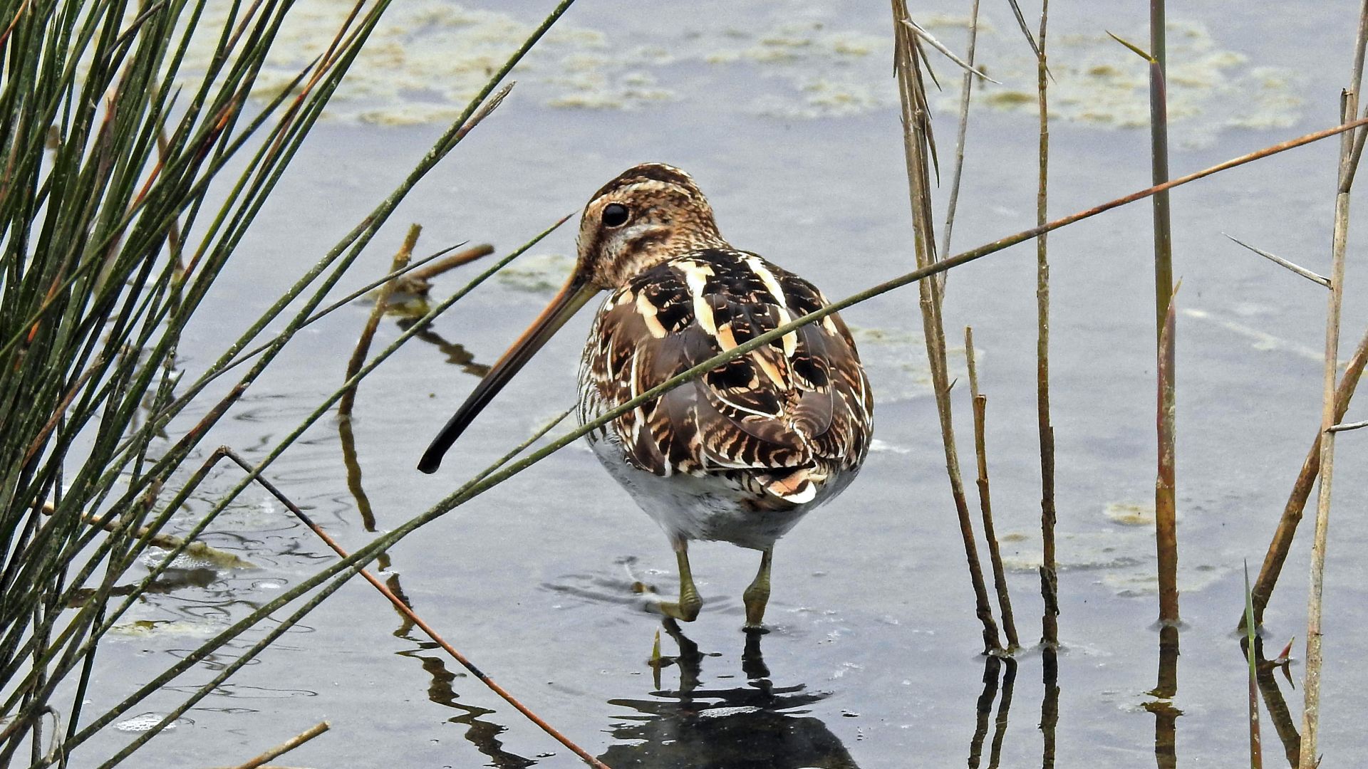 La bécassine des marais est, avec la bécassine double (plus grande) et la bécassine sourde (plus petite), une des trois espèces que l'on trouve dans les zones humides et marais de France. Ce sont des oiseaux méfiants qui se cachent dans la végétation et passent leur temps à sonder la vase avec leur long bec très sensible pour y dénicher limaçons, larves et mollusques. Outre leur chant territorial caractéristique et leur drôle d'allure rebondie sur leurs pattes courtaudes, les bécassines sont également connues pour leurs parades nuptiales spectaculaires. Bécassine est aussi le nom d'une héroïne de romans et BD qui fut nommée ainsi en raison de son apparence ronde et naïve renvoyant à celle de notre amie volatile.