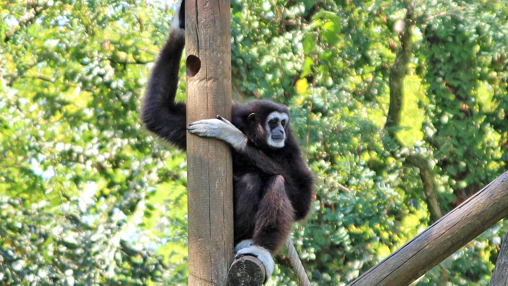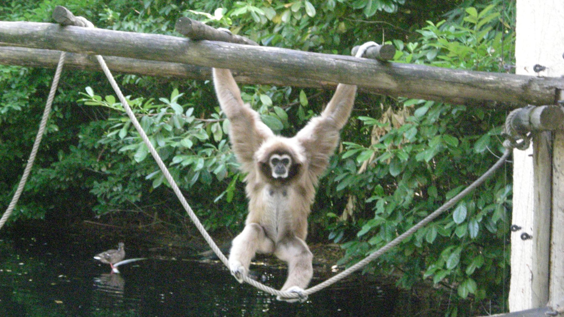 Le gibbon Lar (Hylobates lar) aussi appelé gibbon à mains blanches, est un grand échalas hyper agile aux membres interminables qui peut être de couleur brun crème ou brun chocolat et vit dans les strates supérieures des forêts tropicales d'Asie du Sud-Est. Chez les gibbons, mâle et femelle se retrouvent à l'aube et commencent leur journée par une série de vocalises spectaculaires, le chant du mâle répondant aux longs hululements de la femelle. Il existe une vingtaine d'espèces différentes de gibbons dont certaines très rares et menacées à l'état sauvage, notre ami à mains blanches ayant lui-même le statut d'espèce 'En danger'. Les gibbons et le siamang appartiennent à la même super-famille des primates Hominoïdes que l'être humain.